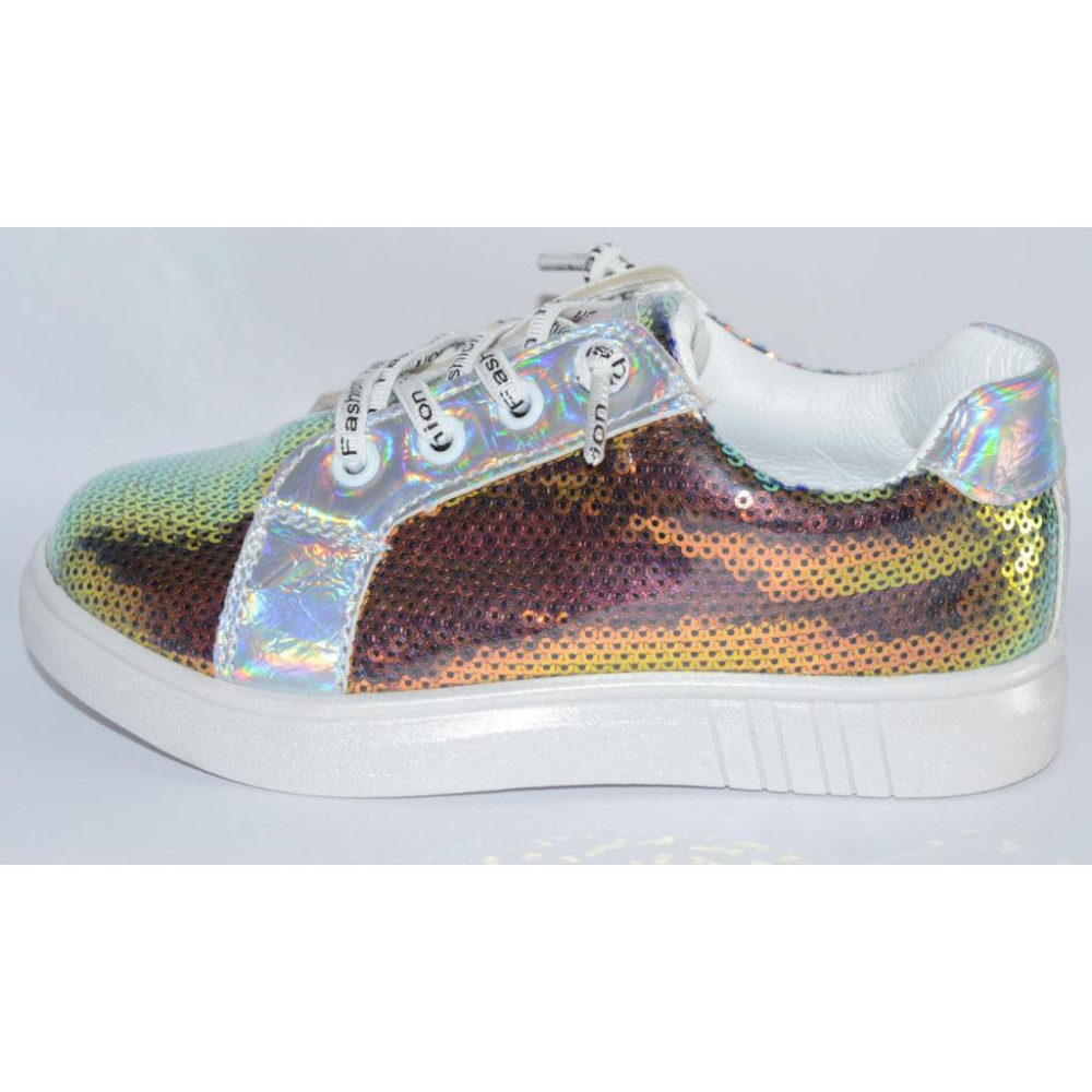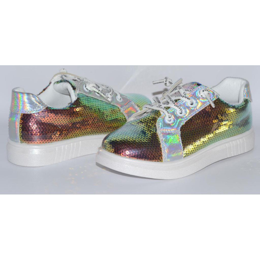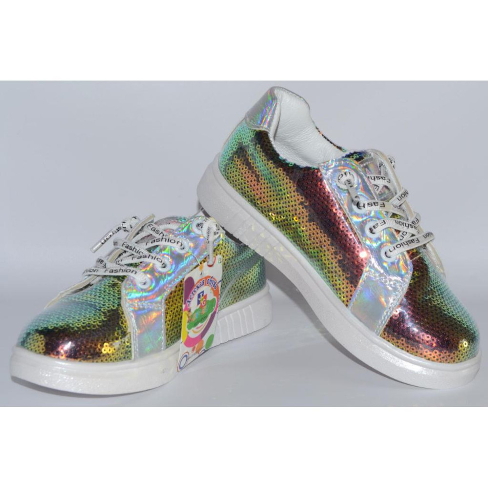 Паєтки в даній моделі захищені прозорим лаком від попадання вологи, тому взуття дуже легко миється і підходить не тільки для сухої, але і для мокрої погоди.