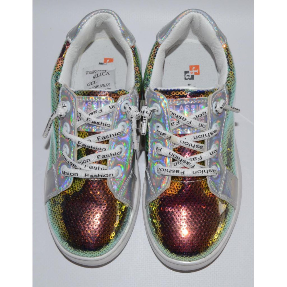 Верх - комбіновані матеріали (шкірозамінник і паєтки, мають властивість хамелеон, змінюють колір в залежності від кута падіння світла).