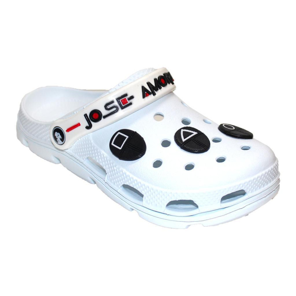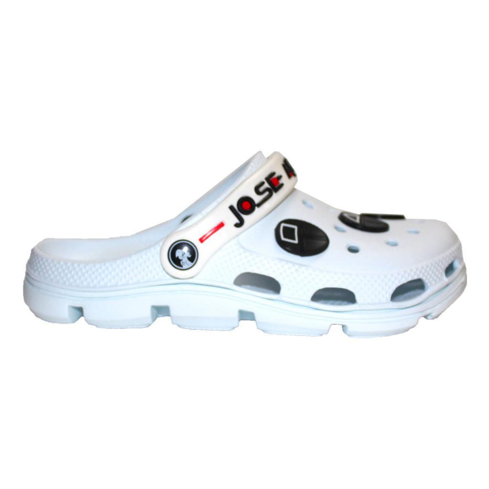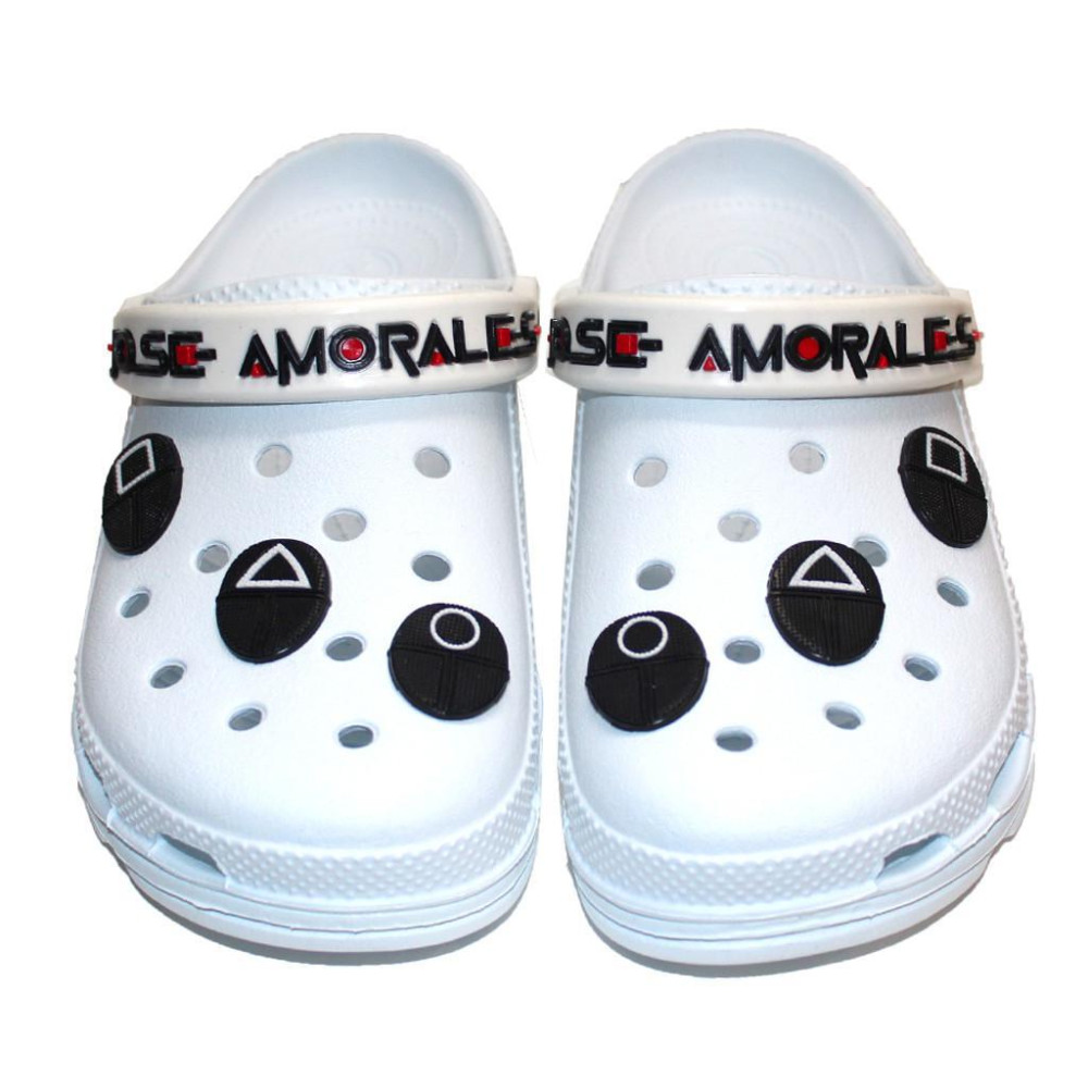 Сабо Jose Amorales со съемными тематическими джибитсами "Игра в кальмара" - стильная обувь для поклонников нашумевшего южнокорейского сериала.