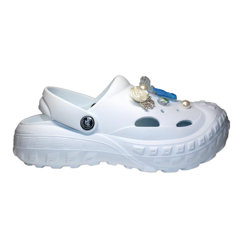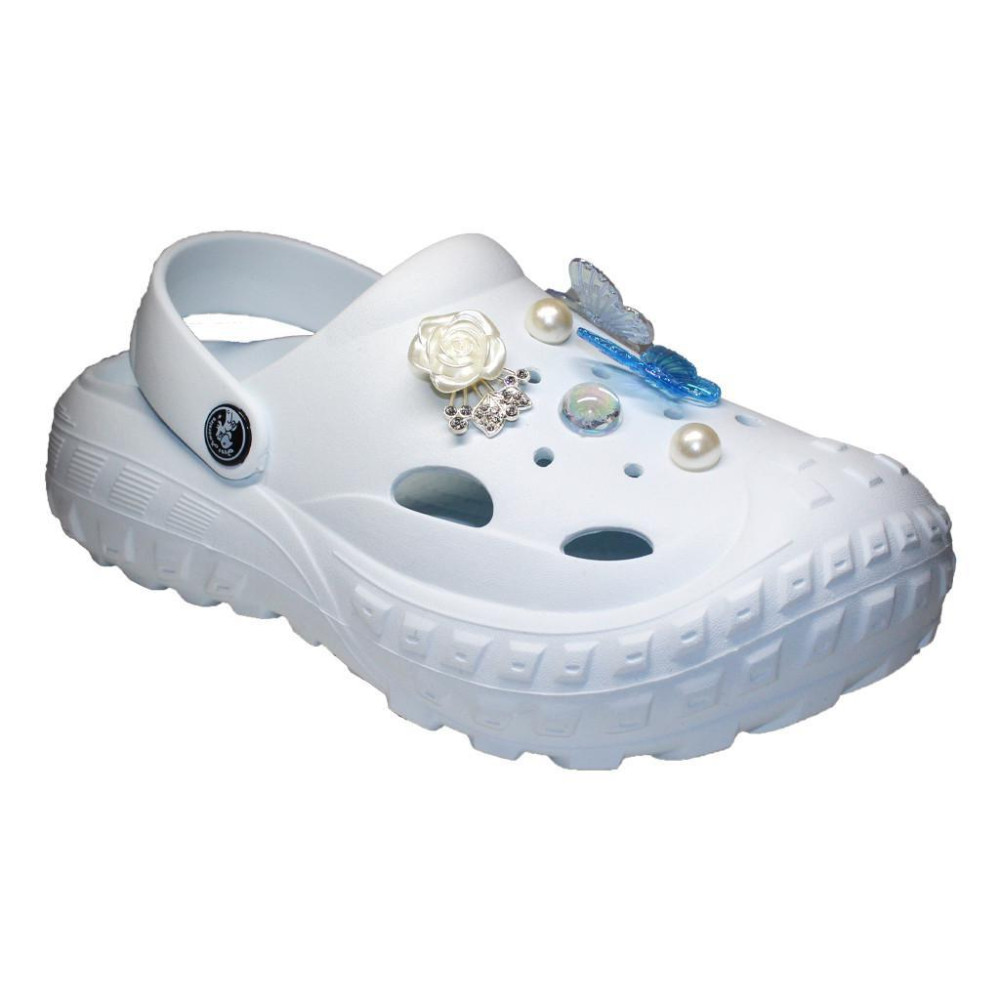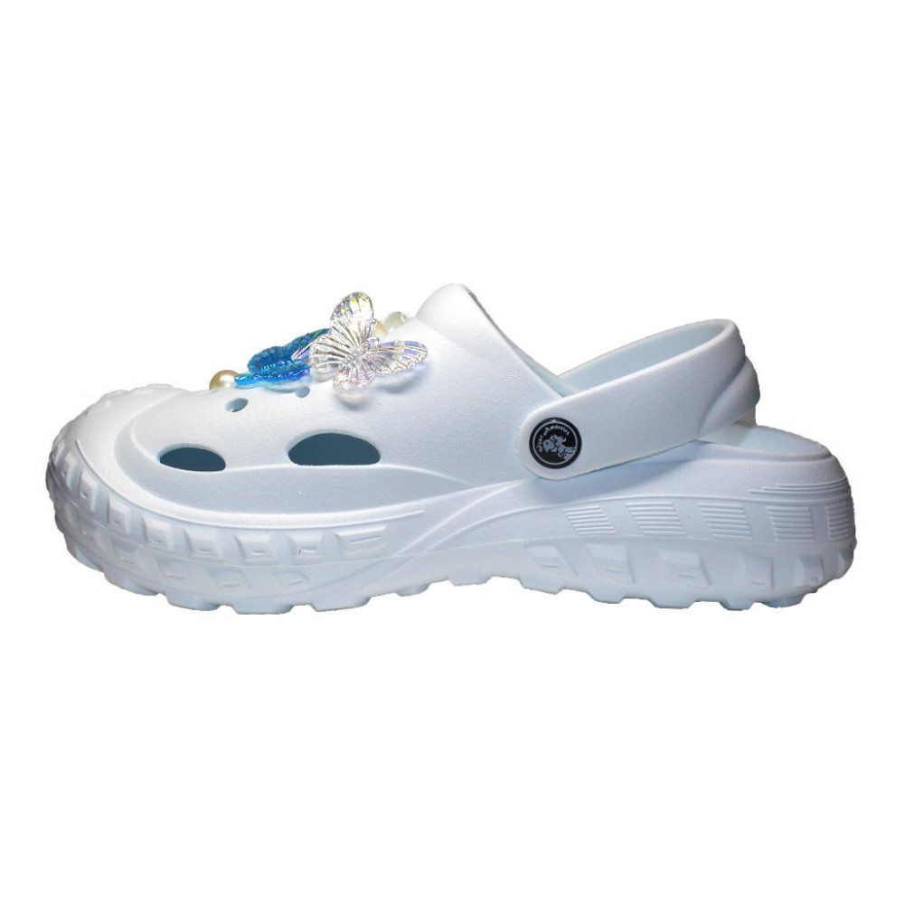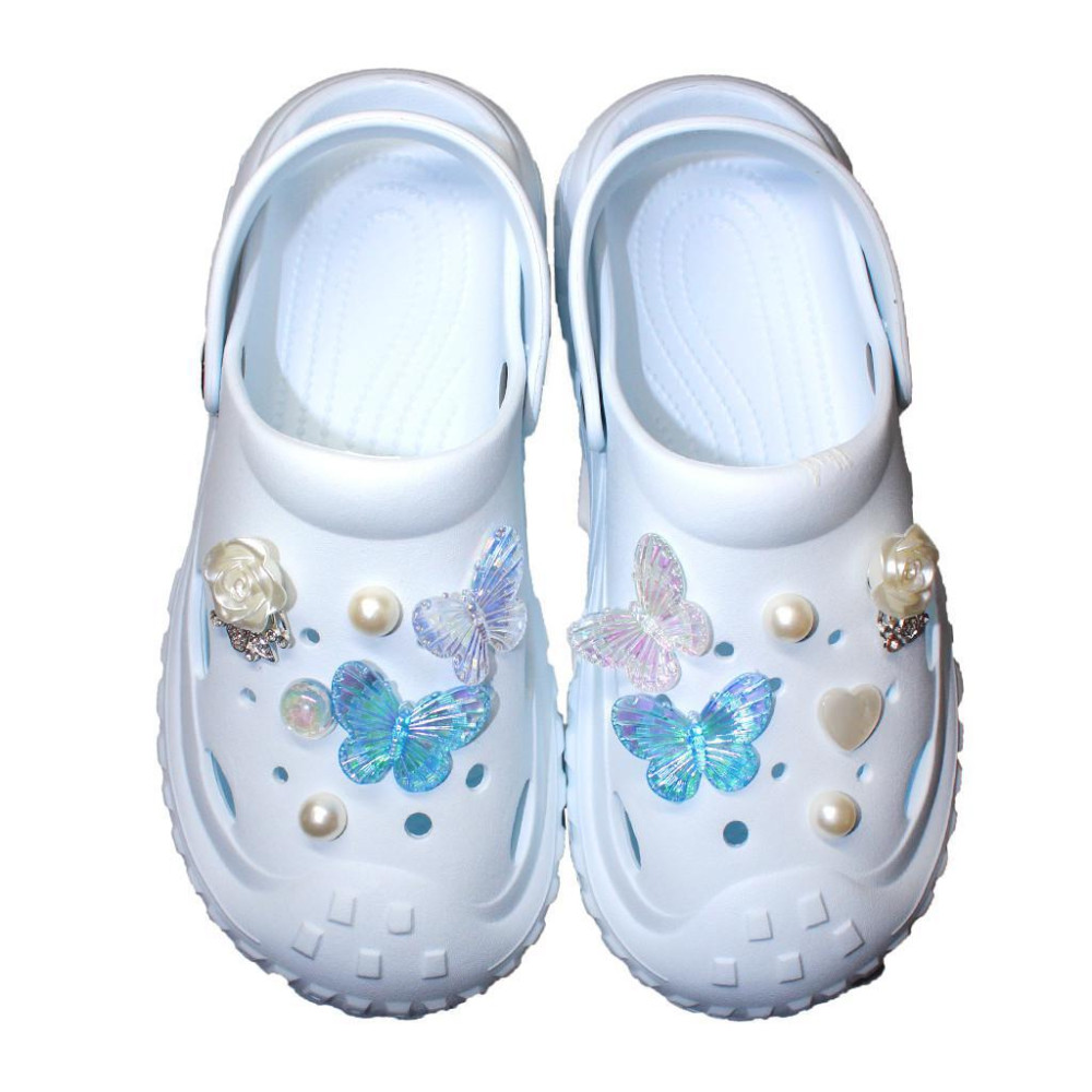 Сабо украшены изящными аксессуарами - бабочками и жемчужинками, которые добавляют обуви изысканного шарма.