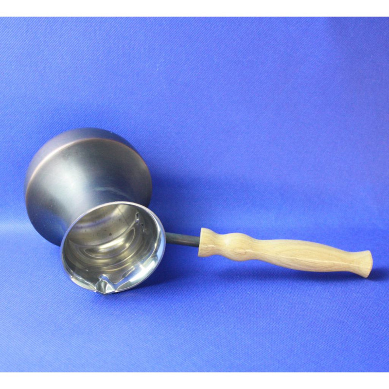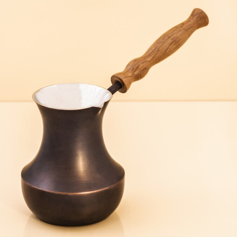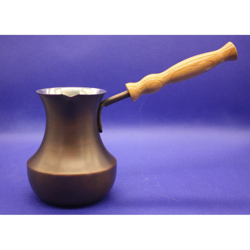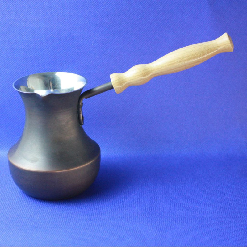 - Элегантный дизайн: Турка с патинированной внешней поверхностью и деревянной ручкой выглядит стильной и станет отличным аксессуаром для любителей кофе.