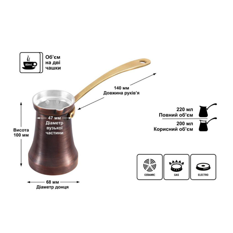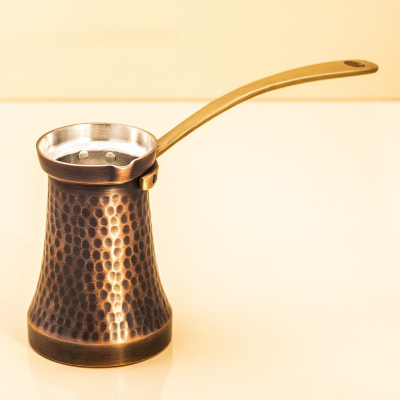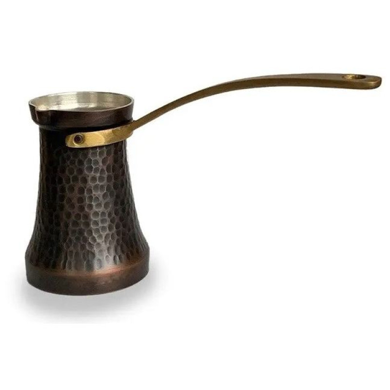 - Материал: Медь — классический выбор для турок, который обеспечивает равномерный прогрев и удержание тепла.