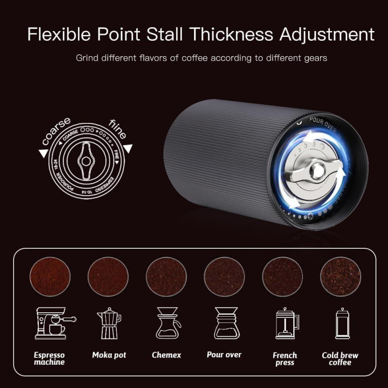 металевим корпусом, широким діапазоном настроювання помелу — від тонкого до грубого для приготування кави в лійці, френч-пресі, пуровері, сифоні, гейзерній кавоварці.