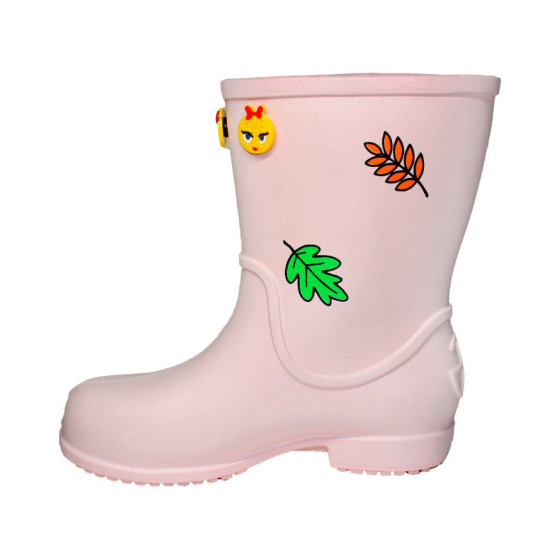 Особенность этой модели — разноцветные наклейки с зонтиками и листочками, которые делают обувь еще ярче и привлекательнее для детей.