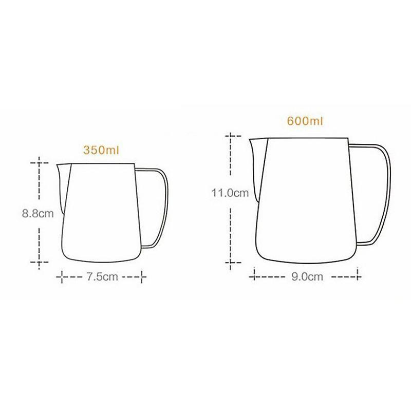 Що ж до об'єму, то в цьому разі вибір залежить від самого бариста залежно від того, який напій ви робите або якої кількості молока вам потрібно збити за один раз. Діапазон розмірів — від 150 мілілітрів до 1 літра. Все залежить від кількості порцій кави, яку Вам потрібно приготувати за короткий термін. Найпопулярніші розміри 350 і 600 мілілітрів. В ідеалі ви за раз готуєте молоко для одного напою. Якщо ж ви використовуєте, великий пітчер відразу на кілька порцій може вийти два різні напої за консистенцією.