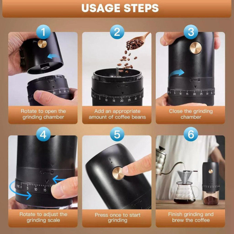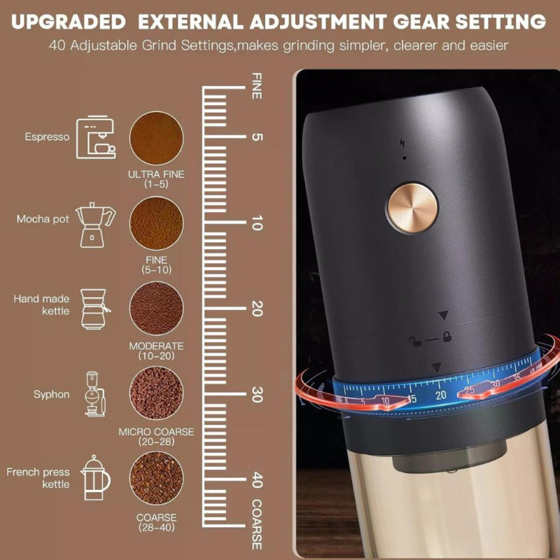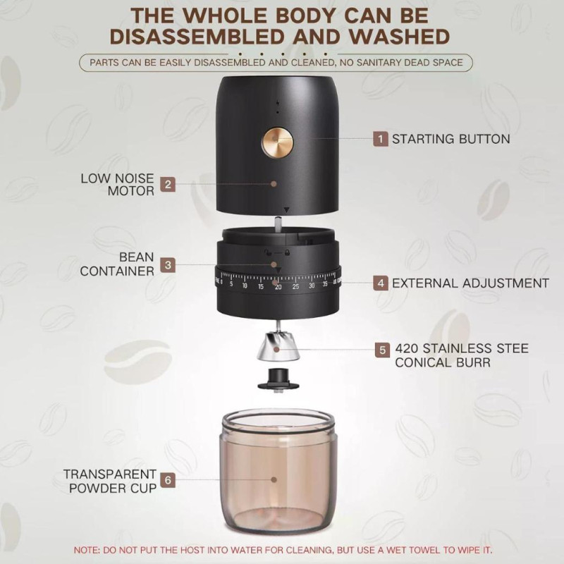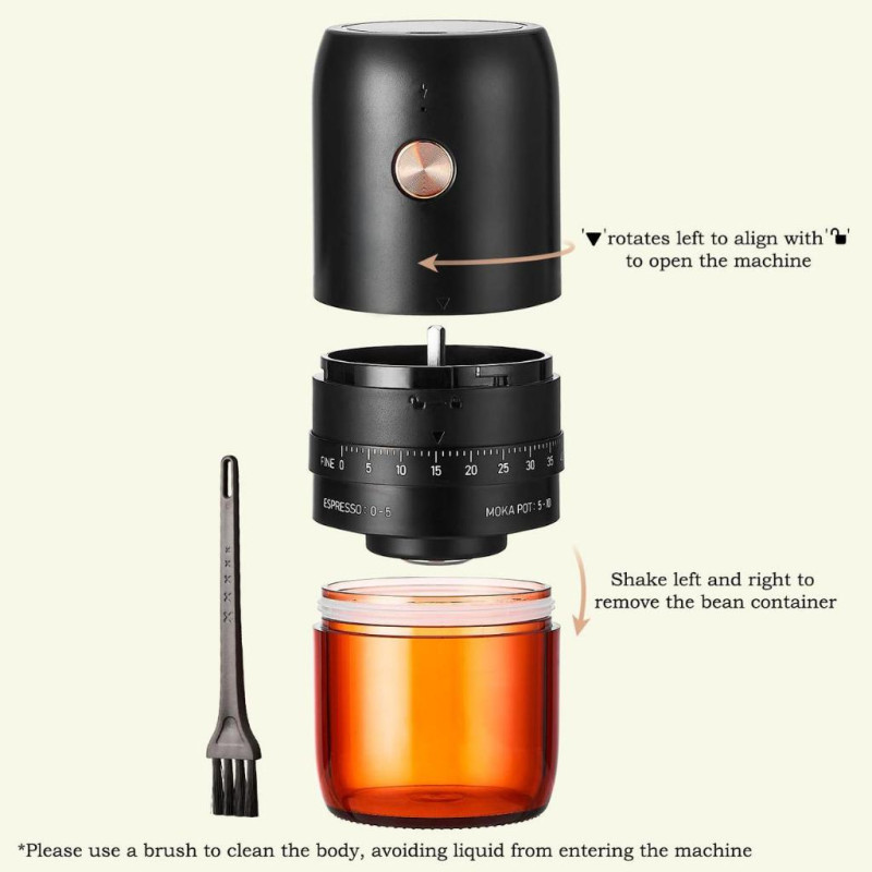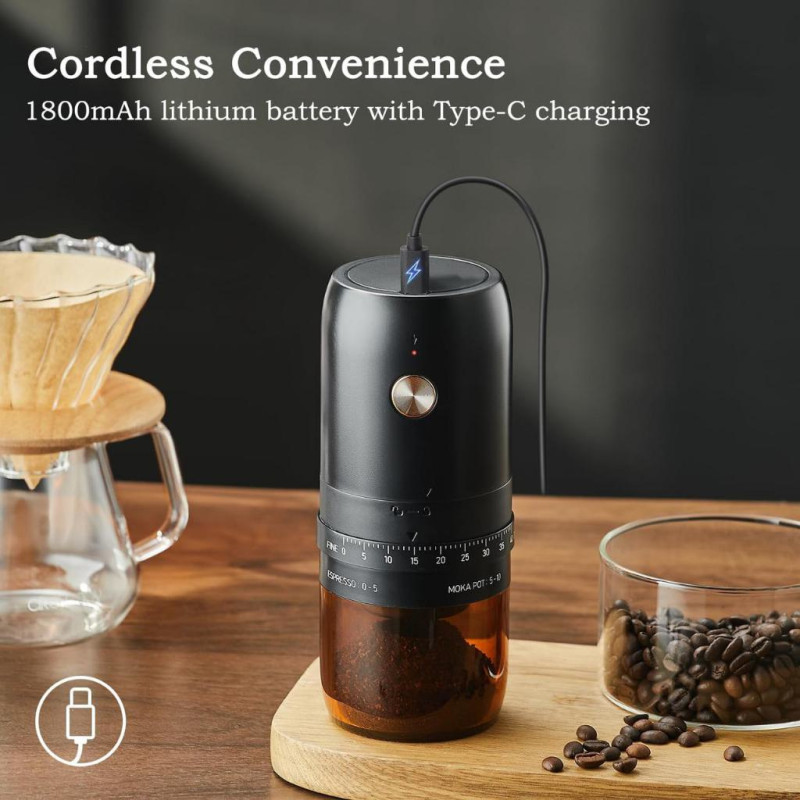 Кавомолка обладнана акумулятором 1800 мА·год, що дозволяє перемолоти до 300 г кави на одному заряді. Заряджання здійснюється через порт USB Type-C, що робить її ідеальною для використання в дорозі, офісі чи кемпінгу.