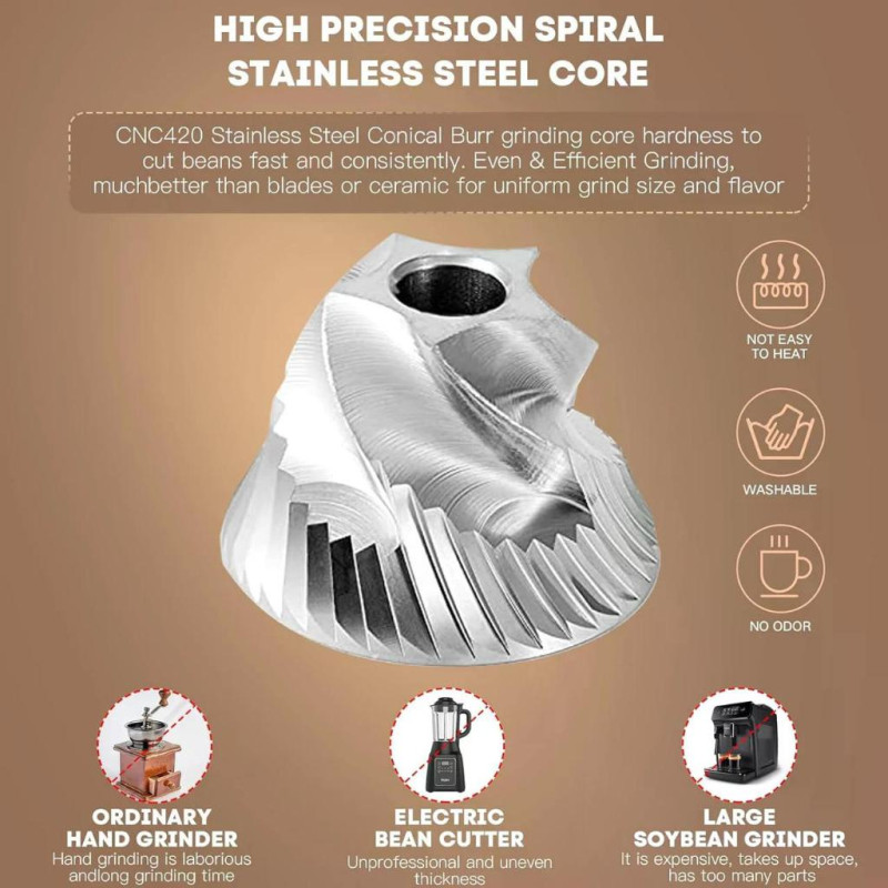 Електрична кавомолка KE77B створена для тих, хто цінує рівномірність, точність та комфорт у приготуванні кави. Металеві конічні жорна зі сталі 420, виготовлені методом CNC, забезпечують стабільний помел без перегріву та кращу однорідність порівняно з ножовими або керамічними кавомолками.