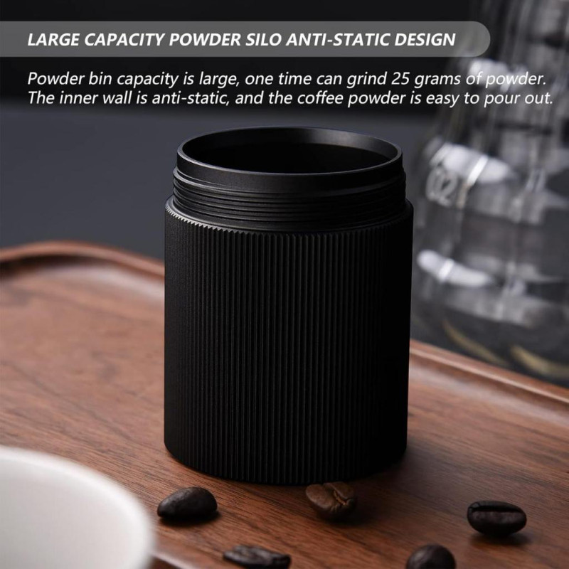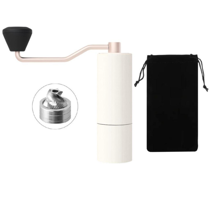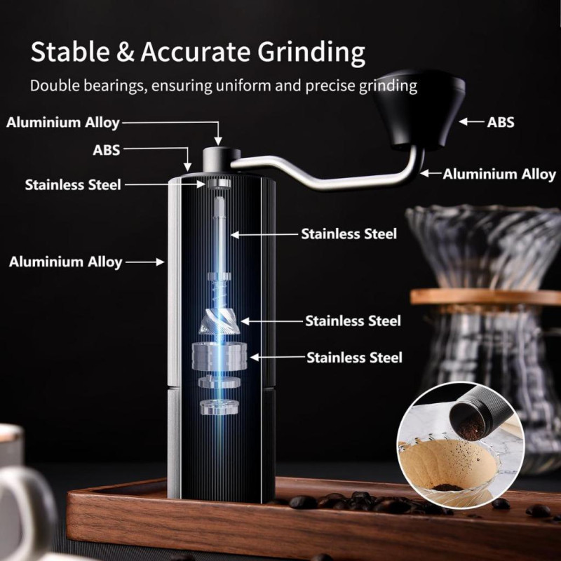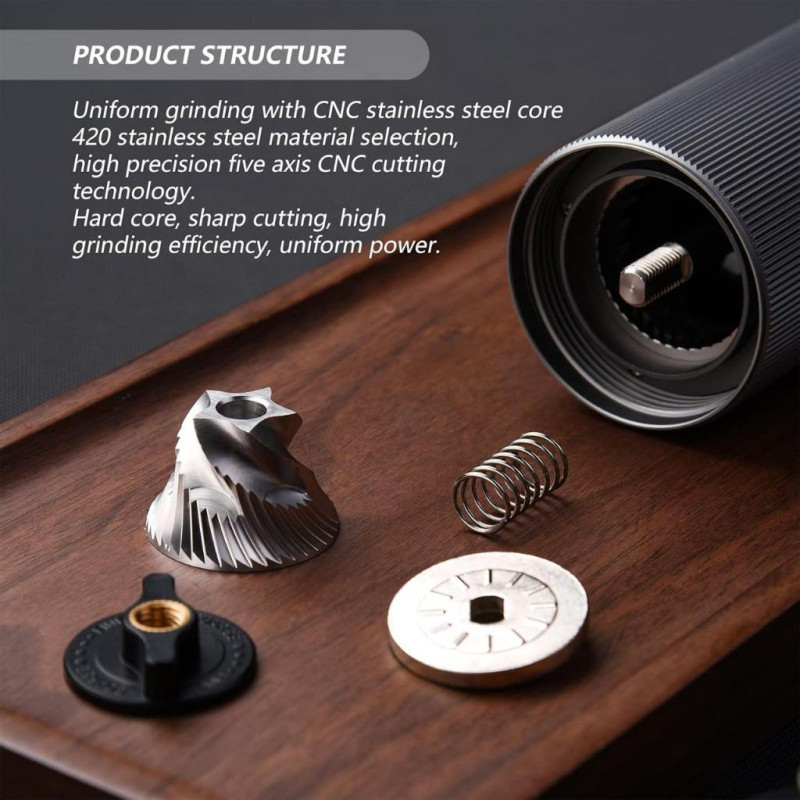 Корпус виготовлений з анодованого алюмінію й має протиковзні насічки, що забезпечують надійне утримання в руці. Внутрішній вал із нержавіючої сталі та подвійна система підшипників гарантують стабільність помелу навіть на дрібних налаштуваннях.